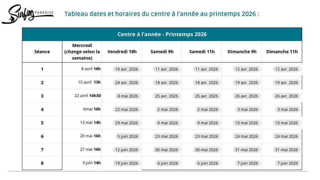 L’école est ouverte tous les jours de mars à décembre et vous propose des cours de surf de 2 heures adaptés à votre âge et à votre niveau. Les horaires de cours varient en fonction des marées et des conditions météo.